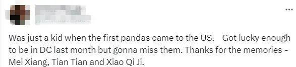 有網(wǎng)友回憶起與大熊貓的點滴時說,“當?shù)谝慌笮茇垈儊淼矫绹鴷r,我還只是個孩子。上個月很幸運能前往華盛頓,我會想念它們的。謝謝你們帶來的回憶——美香、添添和小奇跡。”