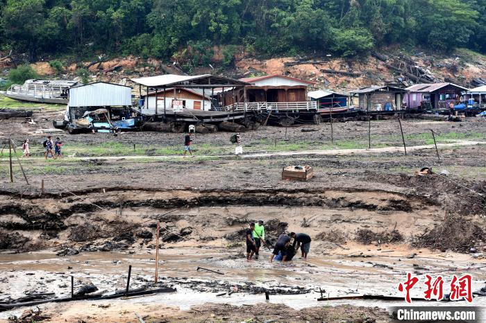 巴西亞馬孫持續(xù)干旱,亞馬孫河多條支流航運物流停擺。圖為10月16日,巴西亞馬孫河支流的大衛(wèi)碼頭,當(dāng)?shù)卣汕踩藛T在疏浚河道。中新社記者 林春茵 攝