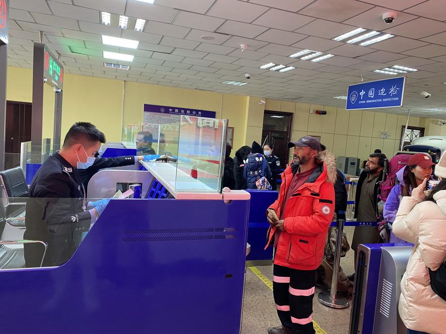11月6日,紅其拉甫邊檢站民警為出境旅客辦理邊檢手續(xù)。(中國網(wǎng)記者 王冉 攝)
