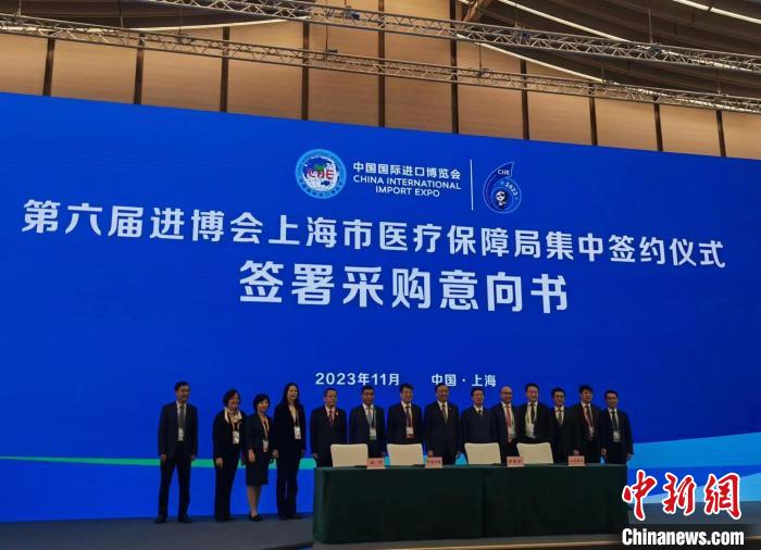 11月8日,上海市醫(yī)療保障局在第六屆進(jìn)博會現(xiàn)場舉行部分帶量采購中選藥品和高值醫(yī)用耗材采購意向集中簽約儀式暨醫(yī)保政策政企交流會。上海市醫(yī)保局供圖