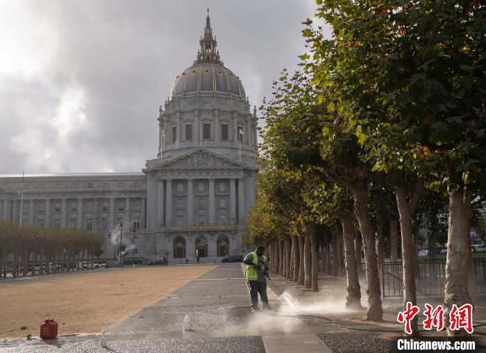 當(dāng)?shù)貢r(shí)間11月6日,工作人員在舊金山市政廳前的市政中心廣場(chǎng)清潔地面。 中新社記者 劉關(guān)關(guān) 攝