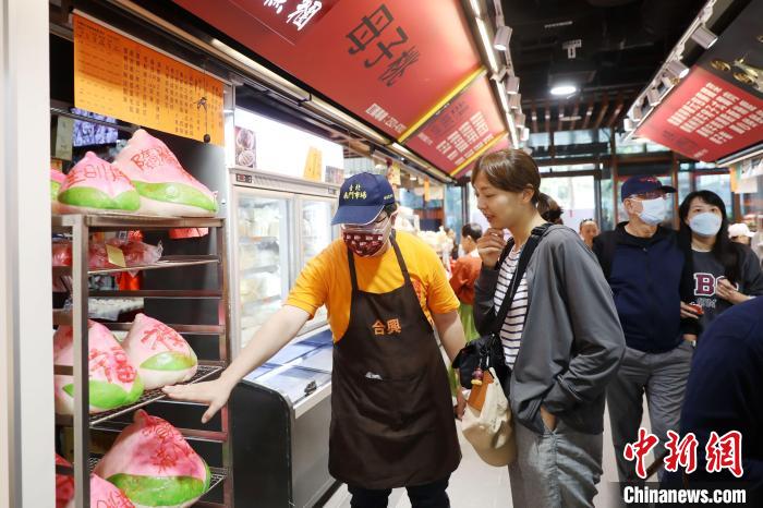 正式開張首日,各攤商早早地布置好店面。記者在市場一樓看到,立家湖州粽店的粽子等美食香氣四溢,購買民眾排起長隊;合興糕團店的巨大壽桃上有“?!薄暗摗薄吧湛鞓贰钡茸郑櫩团恼?;大連食品店整齊擺著各類堅果,并掛著湖南臘腸、廣東臘肉等熟食。
