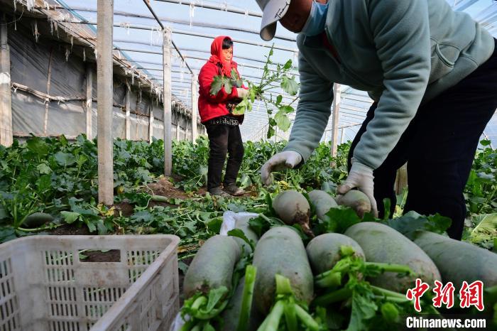 11月11日,天津西青區(qū)辛口鎮(zhèn)小沙窩村,村民在大棚中將采收后的蘿卜裝入筐中。天津市西青區(qū)辛口鎮(zhèn)古時歷經(jīng)多次河水泛濫,大量泥沙及有機(jī)物逐步沉積,形成特有的“上沙下粘”土壤條件,造就了沙窩蘿卜脆嫩多汁,口感清爽,味道甘甜。 中新社記者 佟郁 攝