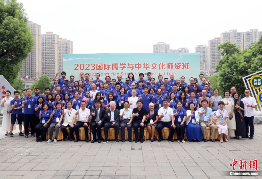2023年8月14日,與會(huì)嘉賓和學(xué)院在活動(dòng)現(xiàn)場(chǎng)合影。當(dāng)日,由北京外國(guó)語大學(xué)與國(guó)際儒學(xué)聯(lián)合會(huì)聯(lián)合主辦的“2023國(guó)際儒學(xué)與中華文化師資班”開班儀式在江蘇省丹陽市舉行,來自20多個(gè)國(guó)家和地區(qū)的120名學(xué)員,參加為期13天的中華傳統(tǒng)文化研修。李國(guó)慶 攝