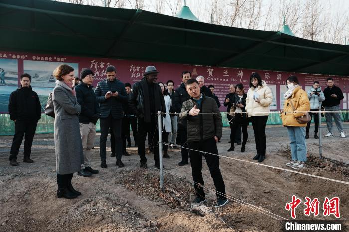 駐華使節(jié)、外交官和外國地方駐華機構代表在賀蘭神酒莊了解葡萄藤埋土工作?!≈行戮W(wǎng)記者 崔楠 攝