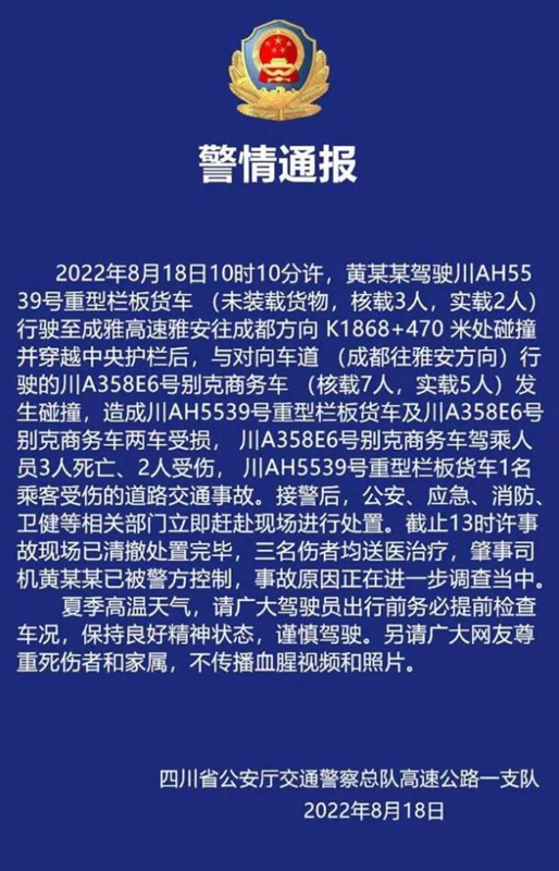 2022年8月18日10時10分許,G5京昆高速公路成雅段K1868公里+150米路段(成都市蒲江縣境內(nèi))發(fā)生川 AH55**貨車沖斷中央護欄與對向正常行駛的川A35***小客車發(fā)生碰撞,造成小客車內(nèi)3人當場死亡,小客車內(nèi)2人和大貨車內(nèi)1人受傷、2車及高速公路路產(chǎn)受損的道路交通事故,直接經(jīng)濟損失約350萬元。