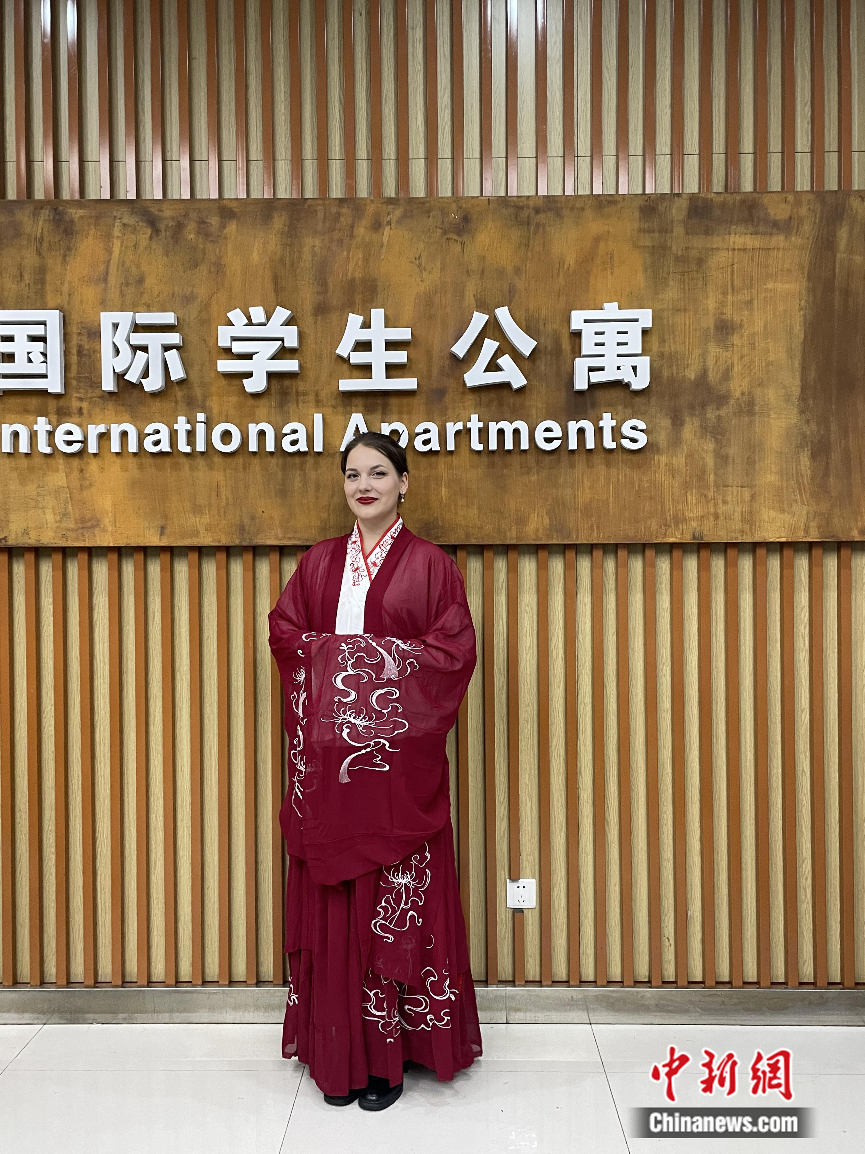 圖為欣薇在學(xué)校嘗試中國(guó)服飾。受訪者供圖