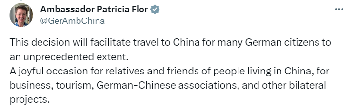 德國駐華大使傅融(Patricia Flor)在社交媒體平臺寫道:“這一決定將在前所未有的程度上為德國公民前往中國帶來便利。無論是在華的商務人士、旅游人士、德中協(xié)會以及從事其他雙邊項目的朋友,這都是一個歡樂時刻?!?/p>