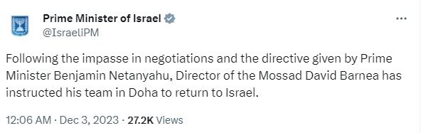 中新網(wǎng)12月3日電 據(jù)卡塔爾半島電視臺(tái)報(bào)道,當(dāng)?shù)貢r(shí)間2日,以色列總理辦公室發(fā)布聲明稱,以色列已從卡塔爾撤回摩薩德談判代表。