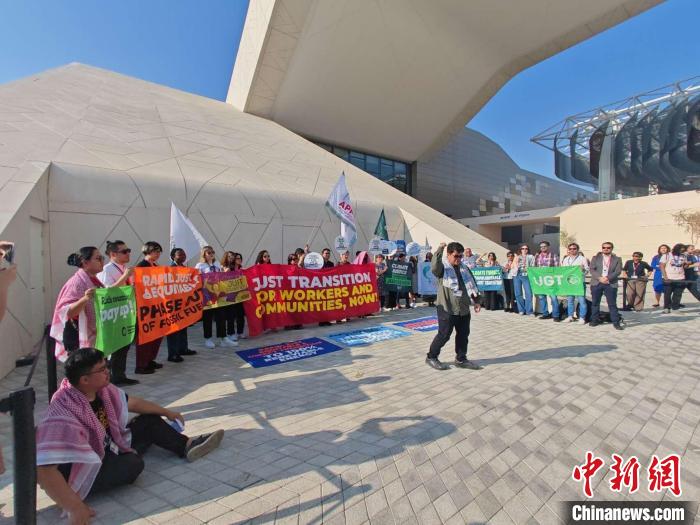 12月9日,阿聯(lián)酋迪拜,抗議者在聯(lián)合國氣候變化迪拜大會藍區(qū)會場集會并呼吁公正轉(zhuǎn)型。 中新社記者 龐無忌 攝