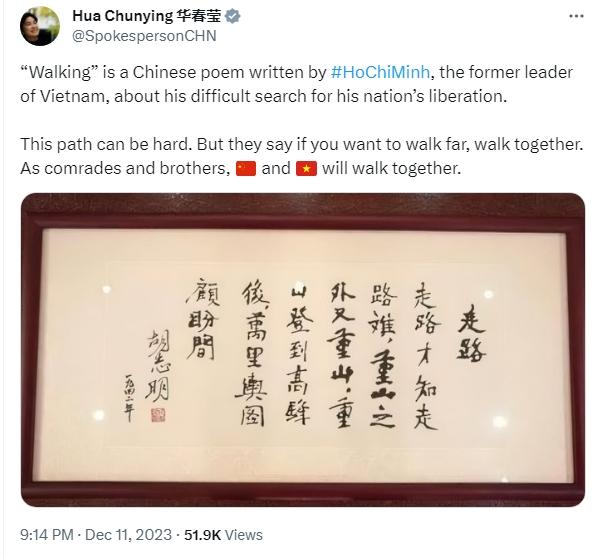 中新網(wǎng)12月12日電 綜合報(bào)道,12月11日,中國外交部發(fā)言人華春瑩在社交平臺(tái)X上發(fā)布了越南老一輩領(lǐng)導(dǎo)人胡志明的一首漢語詩《走路》:“走路才知走路難,重山之外又重山。重山登到高峰后,萬里輿圖顧盼間?!?/p>