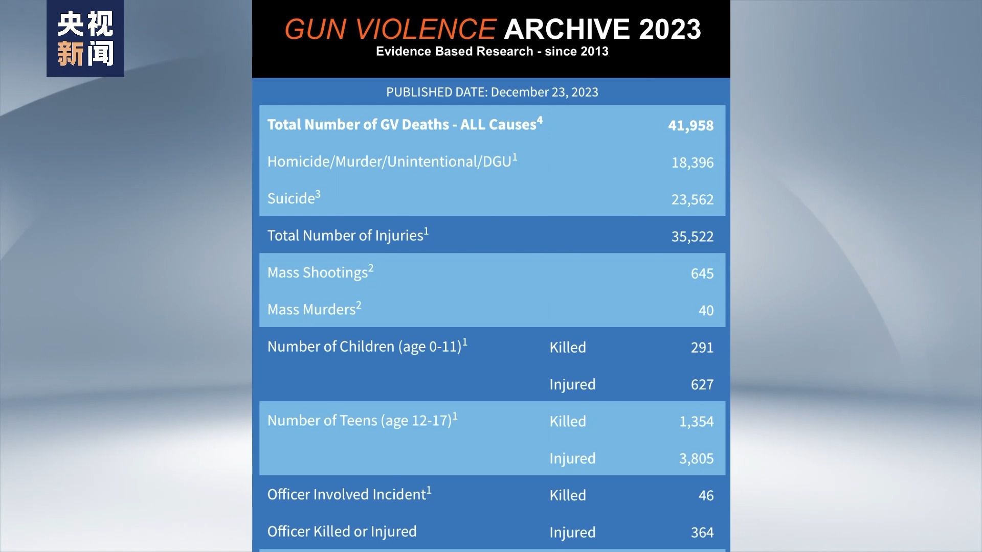 據(jù)美國(guó)“槍支暴力檔案”網(wǎng)站統(tǒng)計(jì),截至12月23日,今年美國(guó)已發(fā)生645起造成除槍手外、至少4人死傷的大規(guī)模槍擊事件,近4.2萬人在各類涉槍事件中死亡。(央視新聞客戶端)