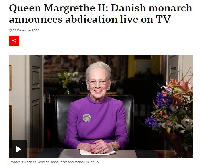 中新網(wǎng)1月1日電 綜合外媒報(bào)道,當(dāng)?shù)貢r間2023年12月31日,現(xiàn)年83歲的丹麥女王瑪格麗特二世在發(fā)表新年致辭時宣布,2024年1月14日是她登基52周年紀(jì)念日,屆時她將退位,把王位傳給其兒子腓特烈王儲。