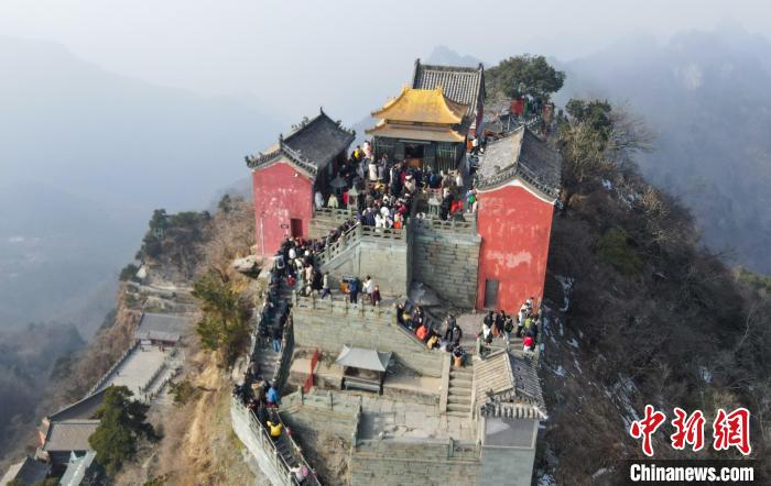 1月1日,武當(dāng)山金頂上前來祈福的游客絡(luò)繹不絕。(無人機(jī)照片)張倩龍 攝