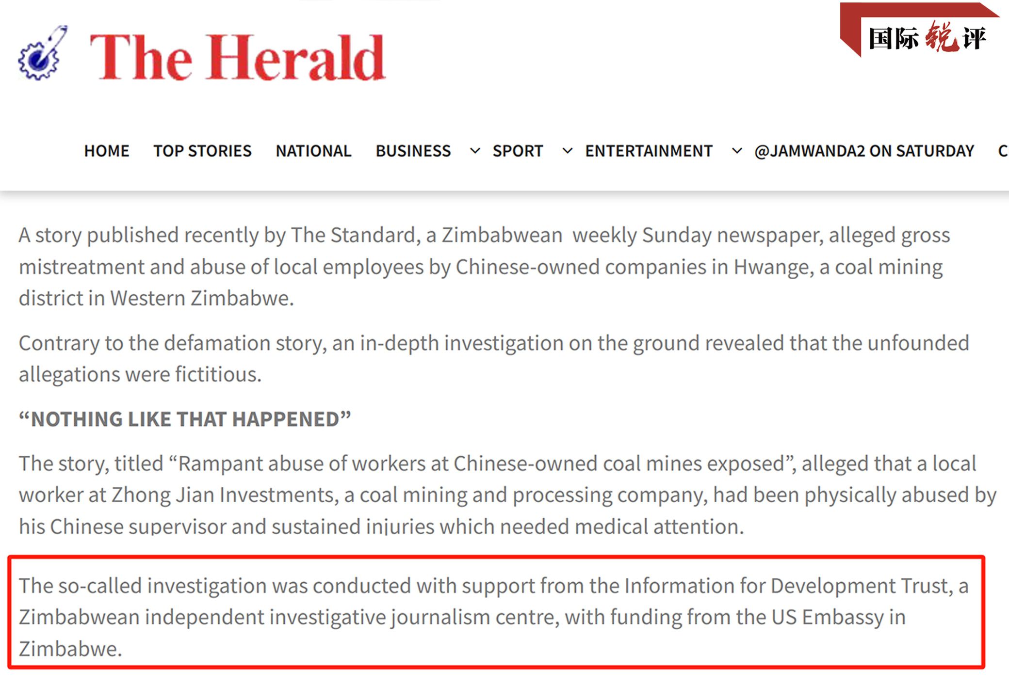 2022年5月,津巴布韋媒體《標(biāo)準(zhǔn)報(bào)》發(fā)布了一篇報(bào)道,污蔑中國(guó)礦企虐待當(dāng)?shù)貑T工,稱這名員工“受傷送醫(yī),還被解雇了”。這家媒體稱,報(bào)道是和津巴布韋一個(gè)名叫“信息促進(jìn)發(fā)展信托基金(IDT)”的機(jī)構(gòu)合作完成的。然而很快,津巴布韋《先驅(qū)報(bào)》就發(fā)文,用大量事實(shí)證明,這名員工只是和中方員工發(fā)生了小口角,并沒(méi)有被毆打,也沒(méi)有被解雇。
