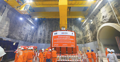 2023年6月10日,工人在巴基斯坦蘇吉吉納里水電站吊裝最后一臺機組轉子。