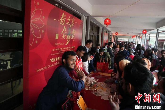 此次活動,受到達(dá)卡大學(xué)師生及當(dāng)?shù)孛癖姷臍g迎。數(shù)百份“?!弊帧⒋郝?lián)、年畫、中國結(jié)、燈籠,營造濃濃的節(jié)日氛圍;近3000人次學(xué)生體驗寫福字、穿漢服等傳統(tǒng)文化;精彩的舞獅表演贏得陣陣喝彩;“恭賀新春”打卡區(qū)更是排起長龍……