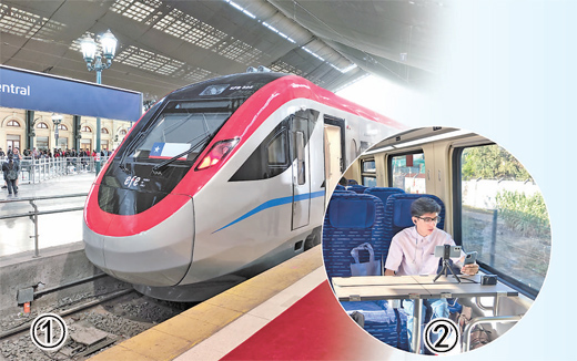 圖①:中企研制的電力內(nèi)燃雙動力動車組列車停靠在智利圣地亞哥中央車站。