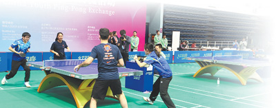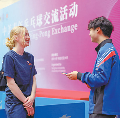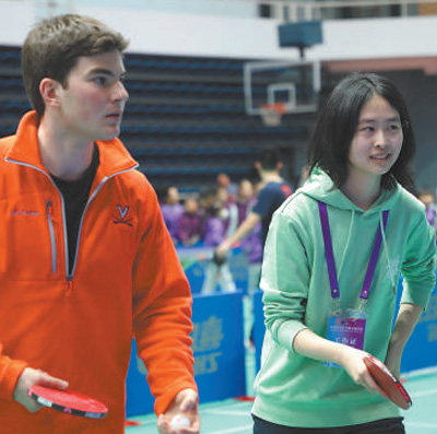 弗吉尼亞大學(xué)學(xué)生米莎與清華大學(xué)學(xué)生曾加寶組成搭檔。在練習(xí)環(huán)節(jié)中,對手朝著米莎的方向打來一記高難度弧圈球,米莎一時(shí)間有些不知所措,只聽曾加寶喊了一句“我來”,便眼疾手快地沖了過去,擋在米莎前面,接住了這個(gè)球。這有趣又溫馨的一幕,引來了現(xiàn)場觀眾的掌聲,也瞬間拉近了兩個(gè)年輕人的距離?!拔业拇顧n一直鼓勵(lì)我,耐心地指導(dǎo)我握拍、擊球。我們一起討論乒乓球和學(xué)業(yè),現(xiàn)在已經(jīng)成了朋友?!泵咨f。