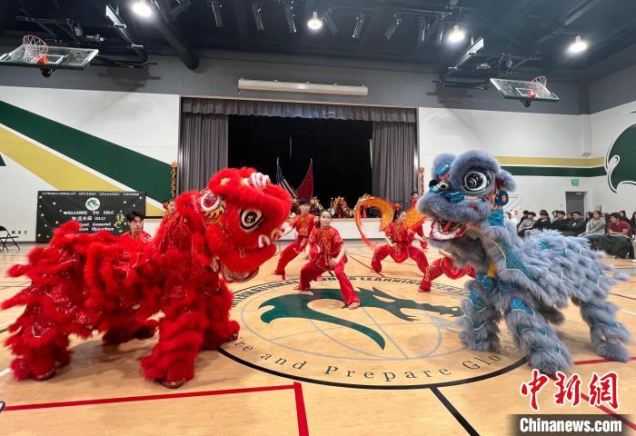 當?shù)貢r間2月5日下午,中國人民大學附屬中學藝術(shù)團在美國洛杉磯國際研究學習中心進行交流演出。圖為武術(shù)《龍騰虎躍》?!≈行律缬浾?張朔 攝