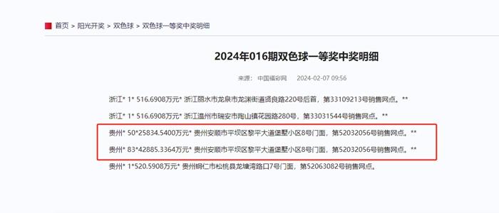 據(jù)中國(guó)福彩網(wǎng)顯示,在貴州省安順市52032056號(hào)銷(xiāo)售網(wǎng)點(diǎn)銷(xiāo)售的兩張一等獎(jiǎng)中獎(jiǎng)彩票中,一張彩票一等獎(jiǎng)中獎(jiǎng)數(shù)量為50注,中獎(jiǎng)金額為25834.5400萬(wàn)元,另一張中獎(jiǎng)數(shù)量為83注,金額為42885.3364萬(wàn)元。