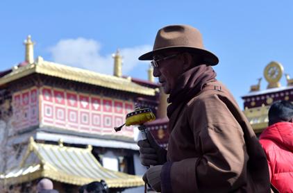 圖為八廓街轉(zhuǎn)經(jīng)的藏族老阿爸老阿媽。中新社記者李林?jǐn)z