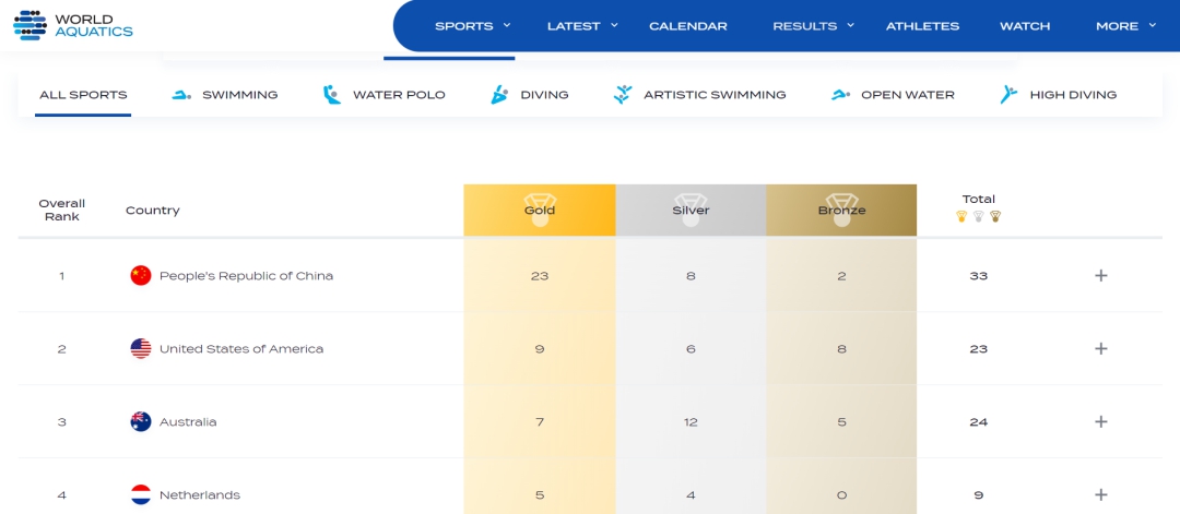 圖為獎牌榜。圖片來源:世界泳聯(lián)網(wǎng)站截圖