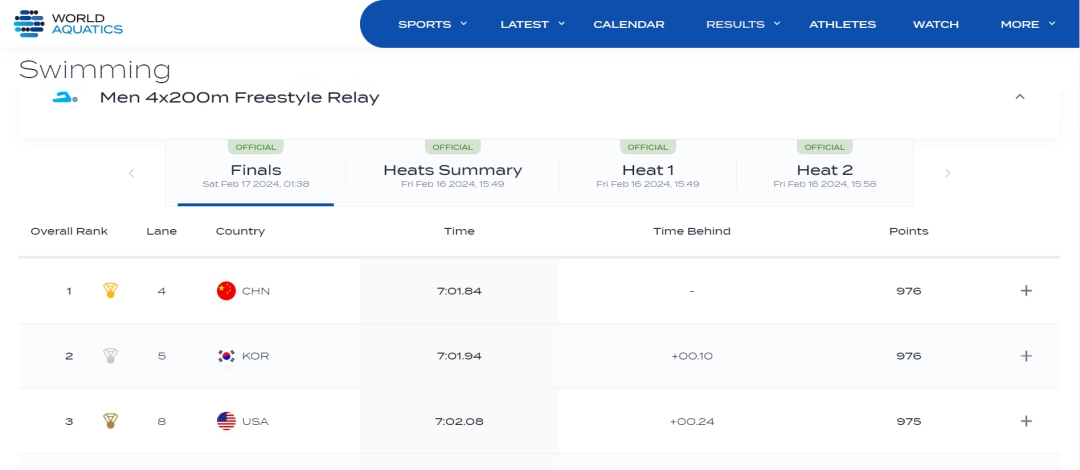 圖為男子4X200米自由泳接力決賽中國隊成績。圖片來源:世界泳聯(lián)網(wǎng)站截圖