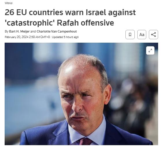 中新網(wǎng)2月20日電 據(jù)路透社消息,當(dāng)?shù)貢r(shí)間2月19日,在比利時(shí)布魯塞爾舉行的歐盟外長(zhǎng)會(huì)議上,除匈牙利外的所有歐盟國(guó)家都警告以色列不要對(duì)拉法發(fā)動(dòng)進(jìn)攻。