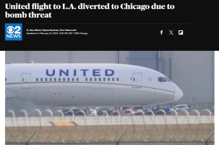 中新網(wǎng)2月22日電 據(jù)美國哥倫比亞廣播公司(CBS)報道,當(dāng)?shù)貢r間21日,美國聯(lián)合航空公司一架飛往洛杉磯的航班,因收到炸彈威脅,改道飛往芝加哥并緊急降落。目前該航班乘客已被疏散。