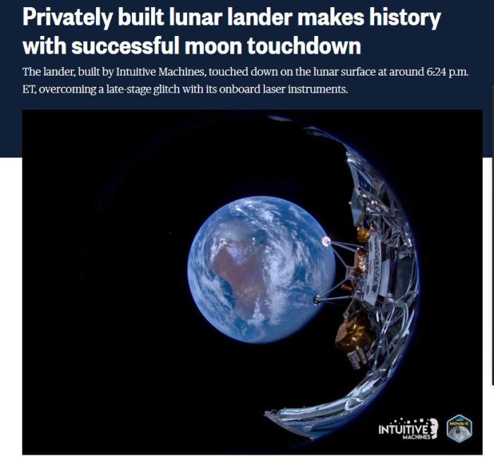據(jù)報道,由“直覺機器” 研發(fā)的著陸器于美東時間下午6點23分左右降落在月球表面。該著陸器是自1972年“阿波羅17號”任務(wù)以來第一艘登上月球的美國航天器。