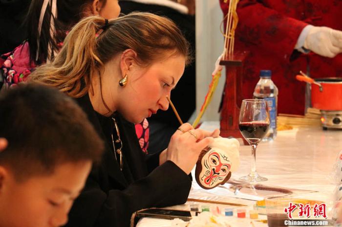 法國青年在迷你廟會(huì)活動(dòng)繪制臉譜。中新網(wǎng)黃方 攝