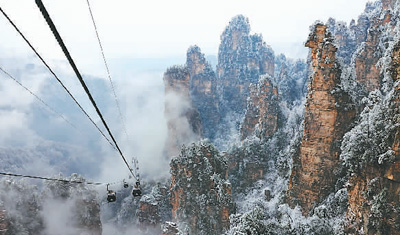 冰雪云霧間的湖南張家界國(guó)家森林公園天子山。