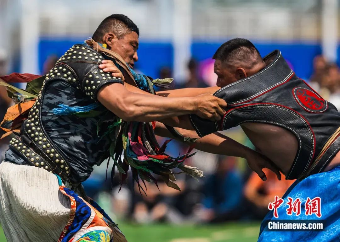 鄂溫克草原上的蒙古族那達慕上演傳統(tǒng)“男兒三藝”——搏克比賽。 呼木吉樂 攝