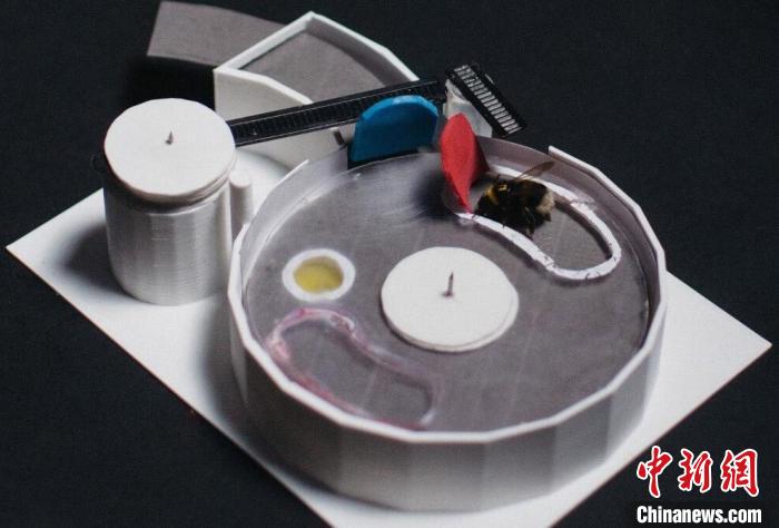 這個兩步謎題盒中黃色圓圈位置有一滴糖水,透過透明塑料蓋可以看到。要獲得獎勵蜜蜂必須推動紅色標簽旋轉(zhuǎn)透明蓋子,直到標簽后的月牙形開口位于黃色液滴上方。不過只有先推開藍色標簽,才能移動紅色標簽。(圖片來自倫敦瑪麗女王大學(xué))。施普林格·自然/供圖