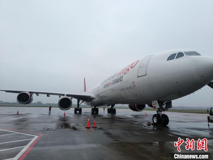 3月9日,由英國伯恩茅斯國際機場起飛的國際貨運航班抵達海口。(??诿捞m國際機場供圖)