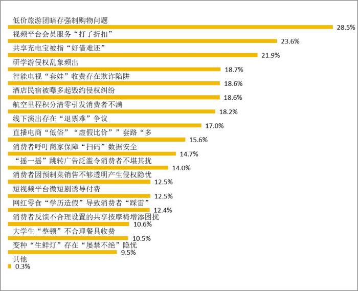 中新網(wǎng)3月14日電(中新財經(jīng)記者 謝藝觀)3月14日,中國消費者協(xié)會對外發(fā)布2024年“激發(fā)消費活力”消費維權(quán)年主題調(diào)查報告,調(diào)查結(jié)果顯示,低價旅游團暗存強制購物、視頻平臺會員服務(wù)“打了折扣”、共享充電寶“好借難還”引共鳴。