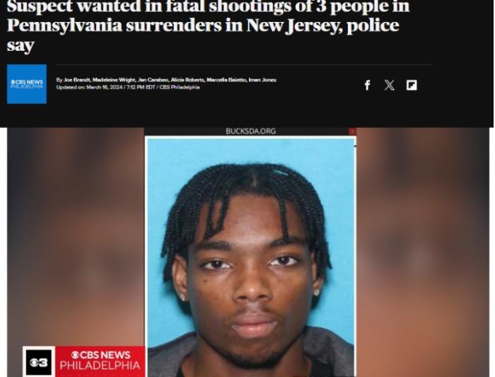 據報道,這名26歲的嫌疑人在兩處不同的住宅中殺害了3人,隨后劫持了一名司機前往新澤西州,最終在新澤西州一處住宅附近被逮捕。報道稱,這起槍擊事件的受害人包括嫌疑人的繼母和他13歲的妹妹。