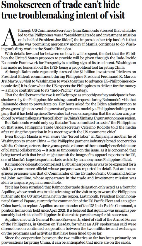 雷蒙多強(qiáng)調(diào),向菲律賓投資的10億美元 “是履行拜登總統(tǒng)于2023年5月訪菲期間與菲總統(tǒng)馬科斯的承諾,加強(qiáng)兩國(guó)經(jīng)濟(jì)聯(lián)系”,但提議這10億美元經(jīng)由印太經(jīng)濟(jì)框架提供,相關(guān)支出細(xì)節(jié)雖尚未披露,但也顯示出美國(guó)政府的真正意圖:將印太經(jīng)濟(jì)框架變成針對(duì)中國(guó)的地緣政治工具。