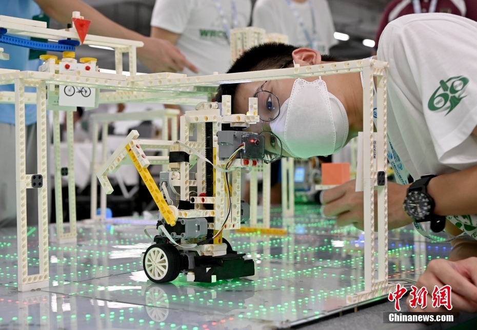 資料圖:一名學(xué)生在觀摩自己設(shè)計編程的機(jī)器人。中新社記者 侯宇 攝