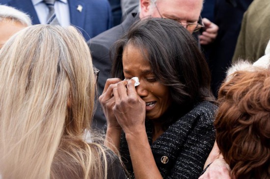 2023年1月6日,在美國(guó)首都華盛頓的國(guó)會(huì)大廈外,一名前國(guó)會(huì)警察遺孀在紀(jì)念“國(guó)會(huì)山騷亂”兩周年紀(jì)念儀式上流淚。新華社記者 劉杰 攝