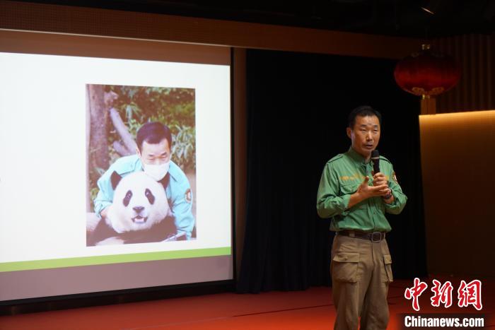 資料圖:姜哲遠講述養(yǎng)育大熊貓“福寶”的故事。中新網(wǎng)記者 劉旭 攝