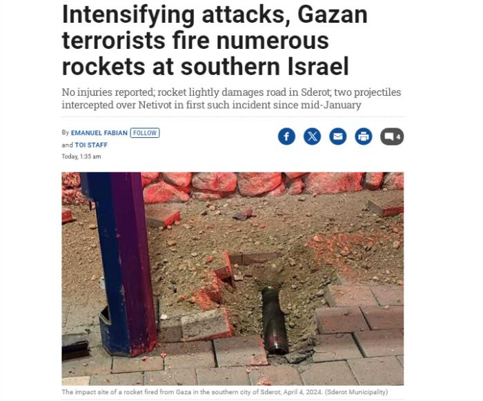 中新網(wǎng)4月5日電 據(jù)《以色列時(shí)報(bào)》報(bào)道,當(dāng)?shù)貢r(shí)間4日晚,以色列國防軍表示,以色列南部城市斯代羅特遭加沙地帶發(fā)射的兩枚火箭彈襲擊。