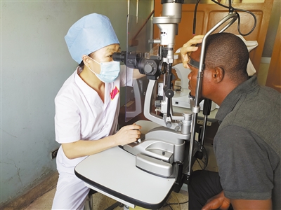 中國專家正在為貝寧當地患者進行眼科檢查。