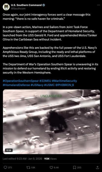 中新網(wǎng)1月10日電 當(dāng)?shù)貢r(shí)間9日,美國(guó)南方司令部確認(rèn),美軍與美國(guó)國(guó)土安全部在一次聯(lián)合行動(dòng)中,在加勒比??刂撇⒖垩骸皧W利娜”號(hào)油輪。據(jù)悉,這是近幾周來(lái)美國(guó)針對(duì)涉委內(nèi)瑞拉原油運(yùn)輸船只實(shí)施的第五次攔截行動(dòng)。