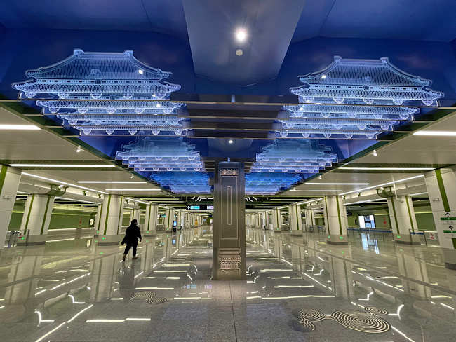 在車站裝修方面,地鐵19號線車站在裝修設(shè)計中突出“薈萃京華”的總體設(shè)計概念,在車站風格中體現(xiàn)北京傳統(tǒng)與現(xiàn)代精華,全線站廳通道口、換乘通道及站臺樓扶梯三角房處以突出導向性和識別性為原則進行重點裝修。以“鳳凰于飛—鳳祥燈會”為設(shè)計主題的新發(fā)地站、繪有“雙鯉戲水”的積水潭站、加入牡丹和景泰藍元素的牡丹園站……乘客可在各站感受到多元化的“地鐵藝術(shù)”。
