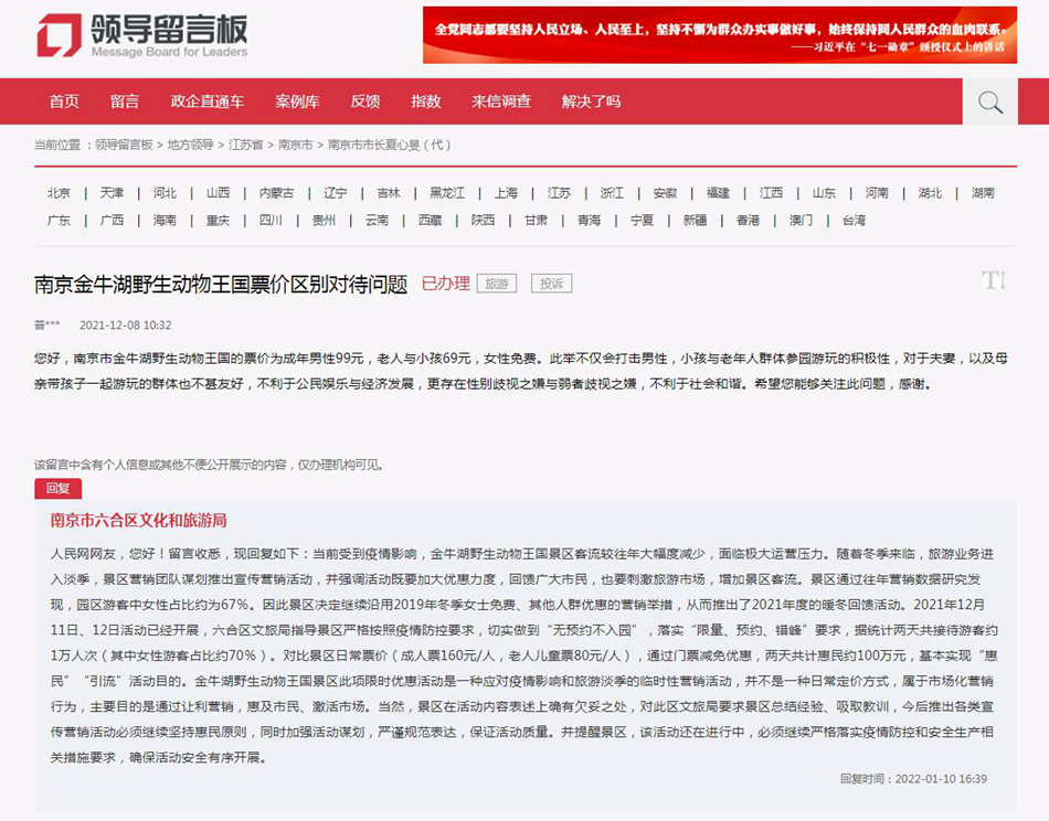 2021年12月8日,網(wǎng)友在人民網(wǎng)“領(lǐng)導留言板”向南京市市長留言稱,南京市金牛湖野生動物王國的票價為成年男性99元,老人與小孩69元,女性免費。此舉不僅打擊男性、小孩與老年人參園游玩的積極性,而且對于夫妻以及母親帶孩子一起游玩的群體也不甚友好,不利于公民娛樂與經(jīng)濟發(fā)展,另外更存在性別歧視與弱者歧視之嫌,不利于社會和諧。