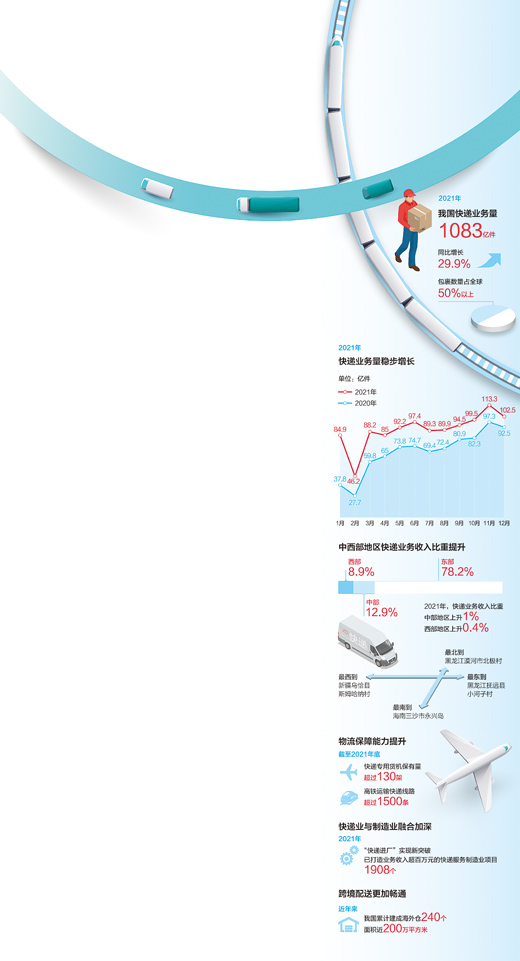 快遞業(yè)既貫通生產、分配、流通、消費各環(huán)節(jié),又關聯(lián)一二三各產業(yè)。蓬勃發(fā)展的快遞業(yè)為經濟發(fā)展注入了怎樣的活力?帶來了哪些行業(yè)內外的發(fā)展機遇?記者帶您盤點2021年中國快遞業(yè)的新進展。