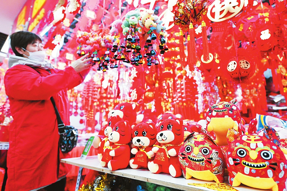 1月14日,太原市某小商品市場(chǎng)內(nèi),富有傳統(tǒng)特色的虎枕虎偶等吸引顧客駐足選購(gòu)。春節(jié)臨近,燈籠、春聯(lián)、福字等節(jié)慶用品中,不少融合了“虎”元素,喜慶紅火中烘托出虎年濃濃的年味。(記者李兆民攝)
