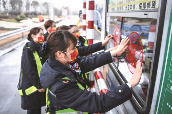 1月24日,在嘉興高速南湖收費(fèi)站,南湖“紅船”巾幗服務(wù)隊(duì)的收費(fèi)員們裝扮著收費(fèi)站,向排隊(duì)等候取卡的駕駛員發(fā)放“福”字、防疫包和車載垃圾袋,送上一份暖暖的關(guān)愛。春節(jié)期間,收費(fèi)員們將堅(jiān)守崗位,用微笑服務(wù)春運(yùn),為高速公路暢通保駕護(hù)航。(王振宇)